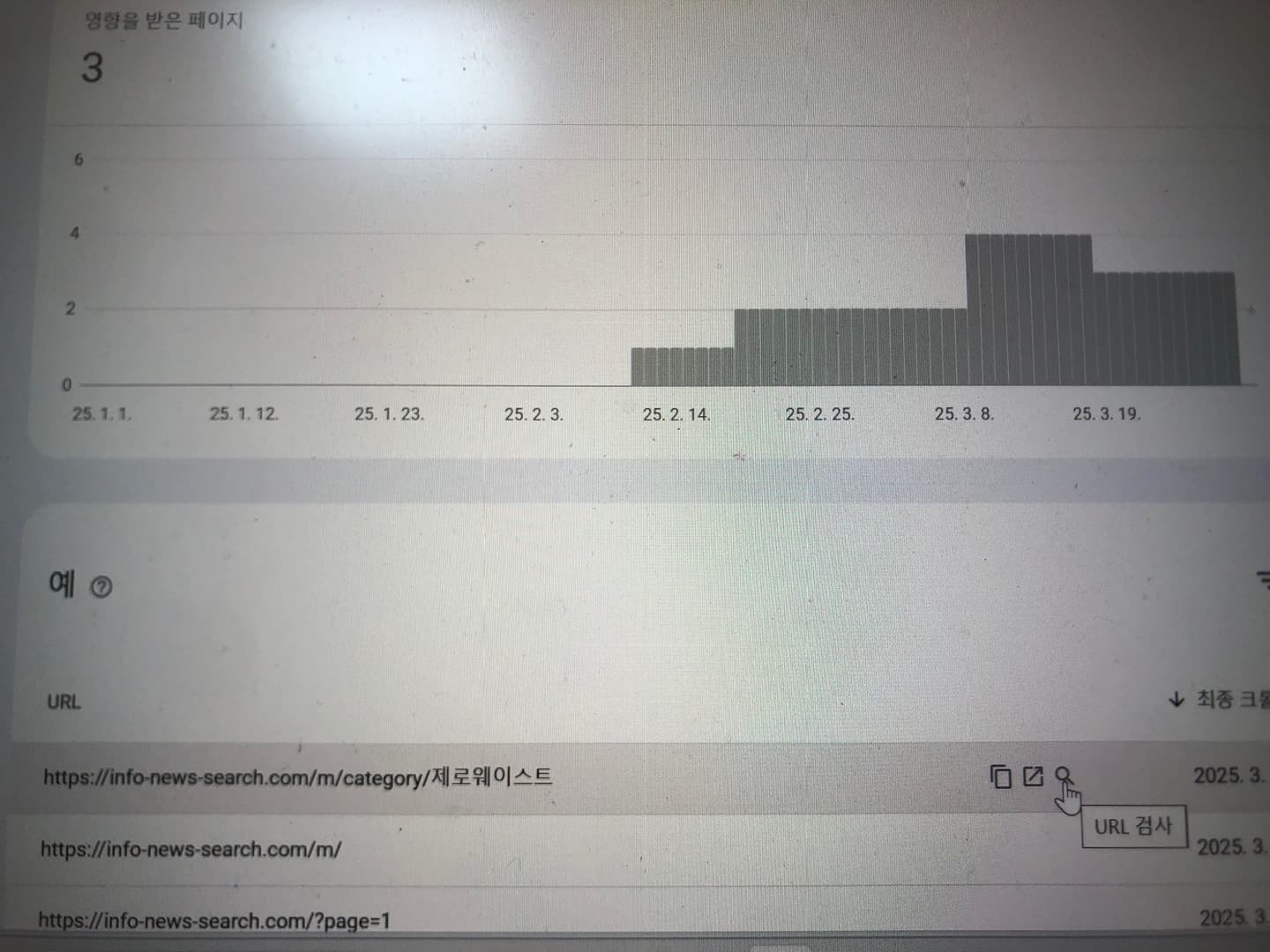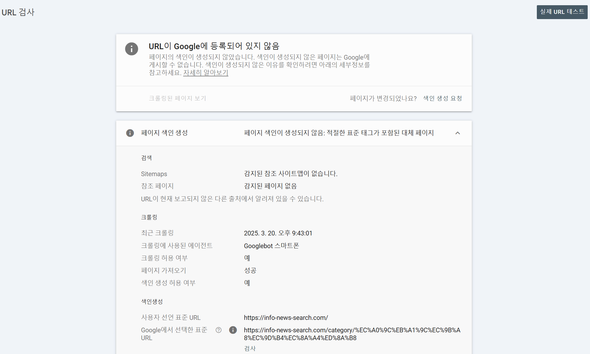 URL 옆의 돋보기 아이콘을 눌러 "URL 검사"를 실행합니다. 이후 "실제 URL 테스트" 버튼을 눌러 URL 상태를 확인하세요.