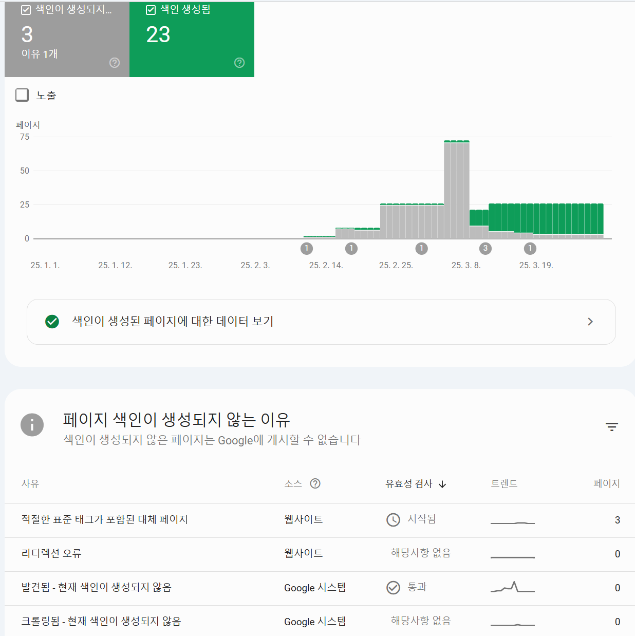 메일에 포함된 링크를 따라 서치 콘솔로 이동합니다. 그러면 색인이 생성된 페이지와 생성되지 않은 페이지 목록이 나옵니다.